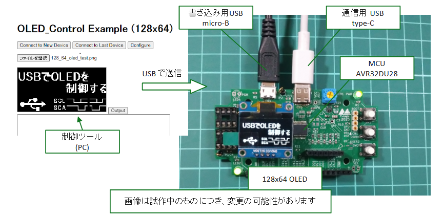 図1 実習キットを用いたUSB-OLED制御デバイス(HIDクラス)の作成例
