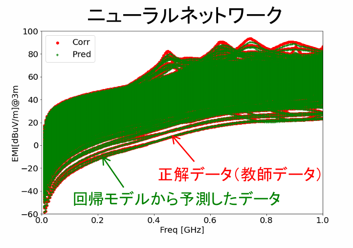 差動線路が2ペアある場合,反射損失(-30dB以下),近端クロストーク(-30dB以下),遠端クロストーク(-30dB以下),挿入損失(-10dB以上)がある設定値になるような配線ルールを遺伝的アルゴリズムで求めます.遺伝的アルゴリズムは,裏で電磁界シミュレーションが必要になりますが,このシミュレーション部分を機械学習で代替します.その結果,通常の遺伝的アルゴリズム+電磁界シミュレーションと比較して,数千倍速く設計ルールを求めることができます. - 配線の物理寸法から遠方放射電界を予測