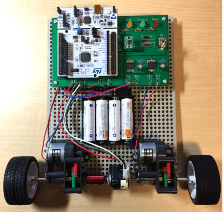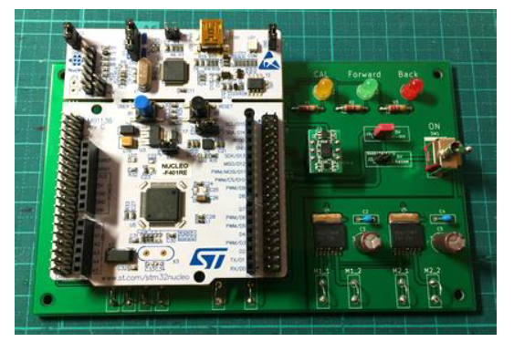 写真4: すぐに開発を始められるNUCLEO-F401REボードを採用 表1: 姿勢の計測とカルマン・フィルタによる真値推定,モータ制御に使用したSTM32F401マイコンの仕様