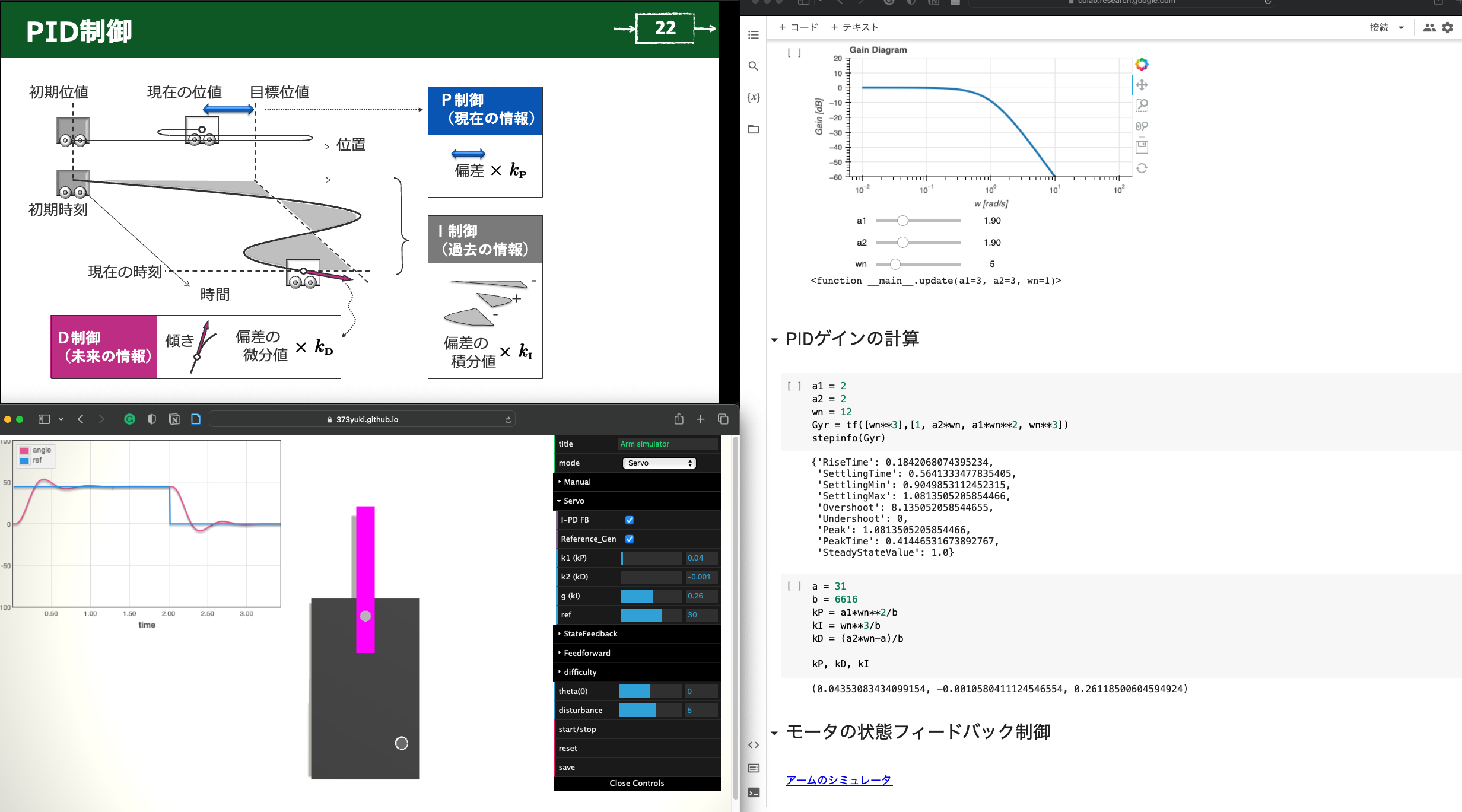 図2 本セミナでは,WEBブラウザ上でPythonを実行できるGoogle Colaboratoryや,アーム/倒立振子のシミュレータも動かしながらPID制御を学ぶ